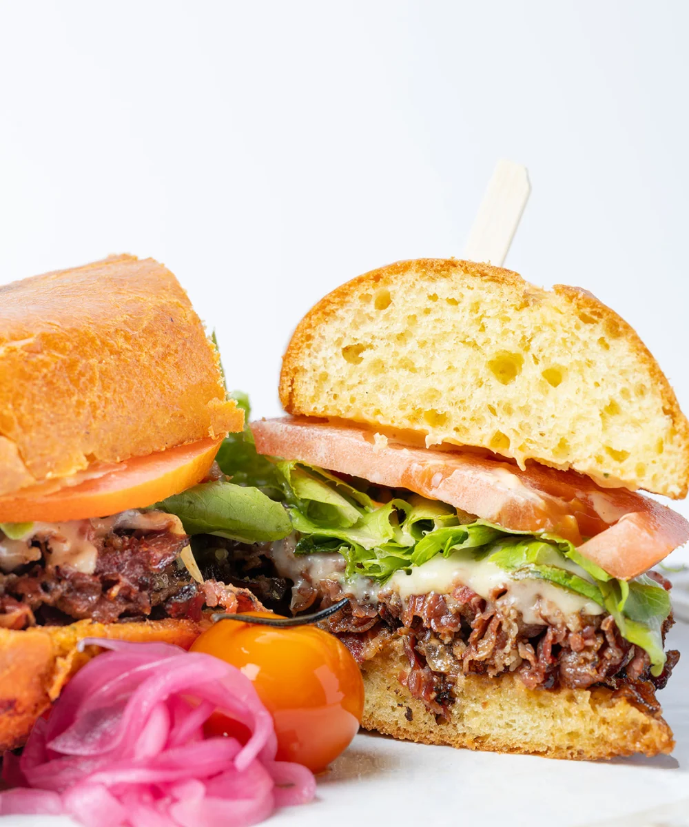 Savor the bold flavors of our Brioche Pastrami Sandwich, a hearty creation featuring tender, seasoned pastrami layered with Swiss cheese, fresh lettuce, juicy tomato, and sautéed onions. The sandwich is elevated with a rich roasted sweet pepper aioli that adds a burst of flavor in every bite. All these delicious ingredients are served on a soft, buttery brioche bun, creating the perfect balance of savory, tangy, and sweet notes. Ideal for lunch or a satisfying mid-day meal, this sandwich is a must-try for anyone craving a gourmet twist on a classic.