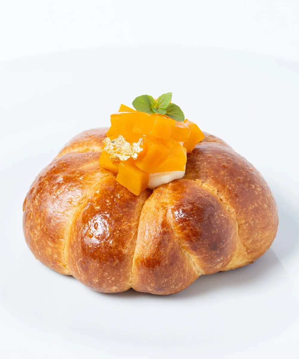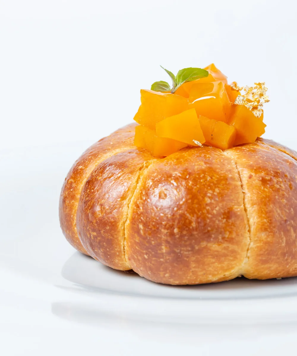 A warm, golden brioche bread, soft and buttery, filled with a luscious cream of pumpkin and cheese that blends savory richness with subtle sweetness. Topped with tender confit pumpkin, this treat offers a cozy, autumnal embrace, perfect for savoring the season’s finest flavors.