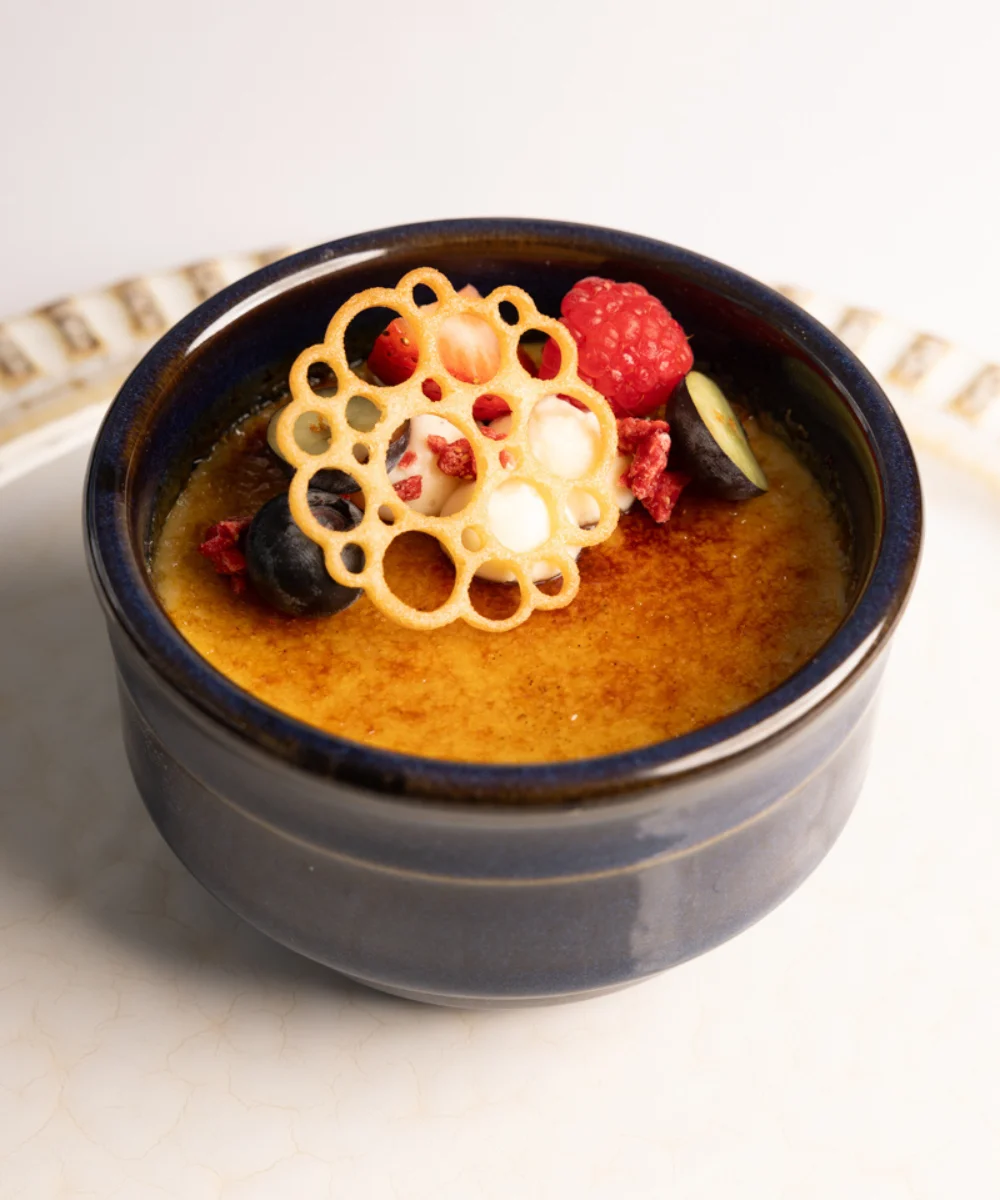 ✧ Seasonal Crème Brûlée with rich custard and caramelized sugar crust, highlighting the finest seasonal flavors.