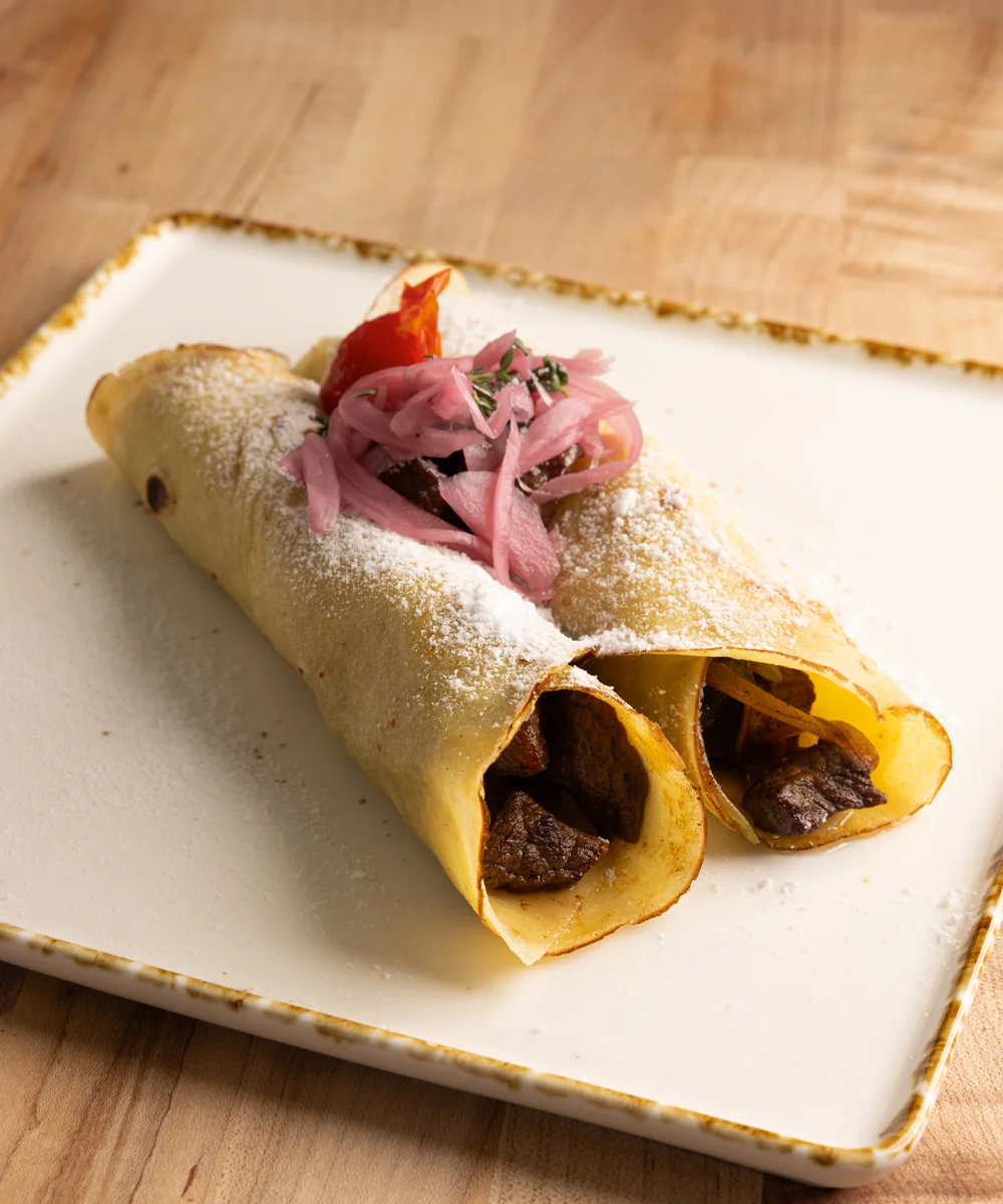 Indulge in our Steakhouse Crepes, featuring two delicate crepes filled with tender sautéed New York steak, earthy wild mushrooms, and melted Muenster cheese. This savory dish brings together rich flavors and comforting textures, making it a perfect choice for steak lovers looking for a unique twist.